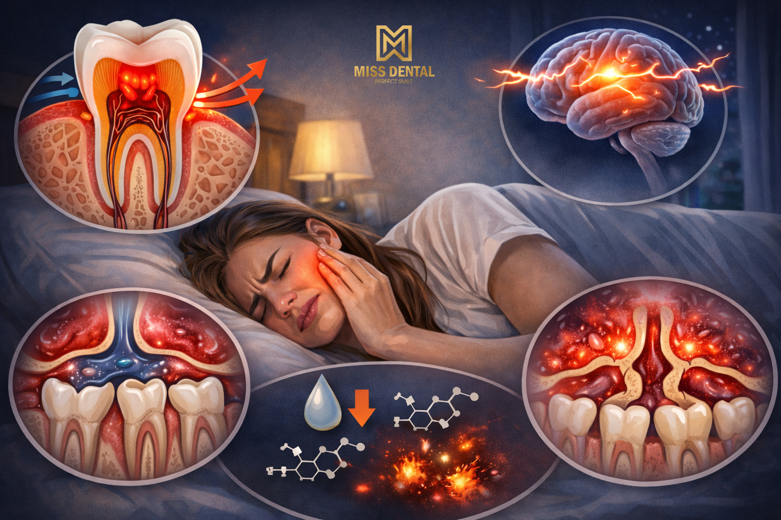 Đau răng về đêm là kết quả của nhiều cơ chế sinh học phối hợp, bao gồm tăng áp lực nội tủy, thay đổi nhịp sinh học, giảm yếu tố xao nhãng và sự nhạy cảm của hệ thần kinh.